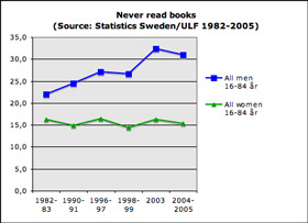 The statistics of Statistics Sweden is rather unique. For 30 years a random choice of 7 000 persons, age 16-84 have answered the question ”Have you been reading books in your leisure time during the last 12 months?” Alternative answers have been ”YES, almost every week”, YES, now and then” and ”NO never”. In the present material from Statistics Sweden we can follow the extent of reading from the beginning of the 1980s.